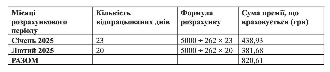 Загальна сума премії ÷ кількість відпрацьованих робочих днів періоду × кількість відпрацьованих робочих днів відповідного місяця.