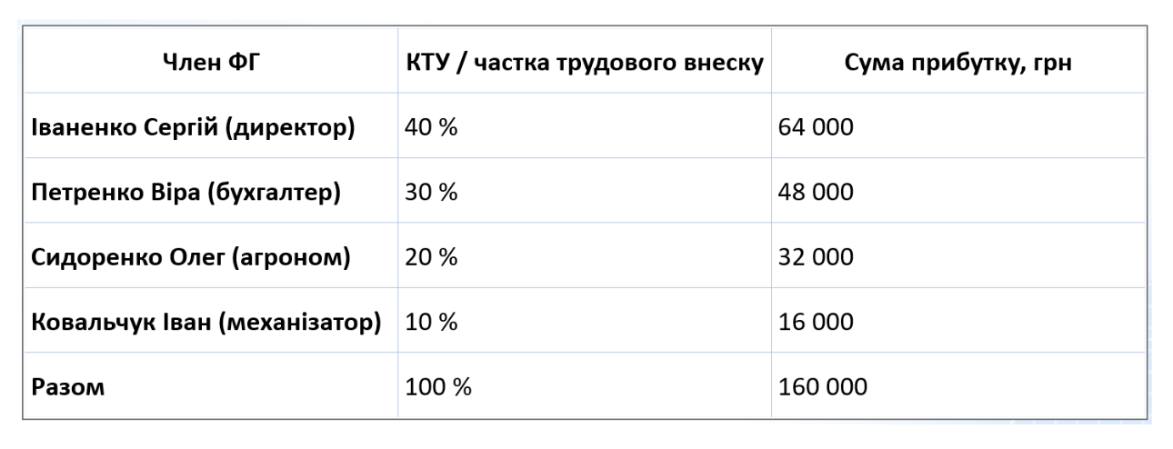 Приклад розподілу прибутку відповідно до трудової участі: