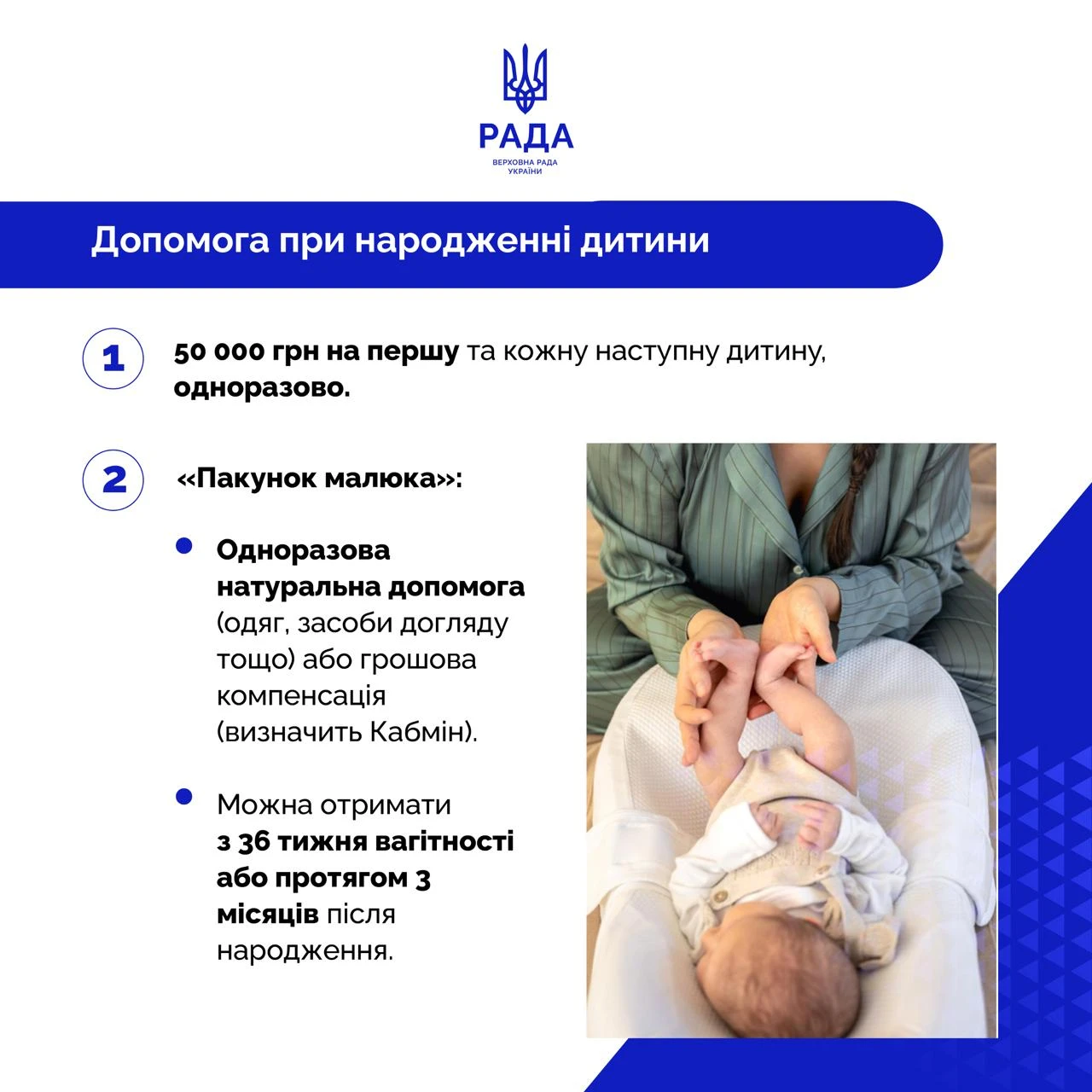 2. Одноразова допомога при народженні першої та кожної наступної дитини – 50 000 грн.