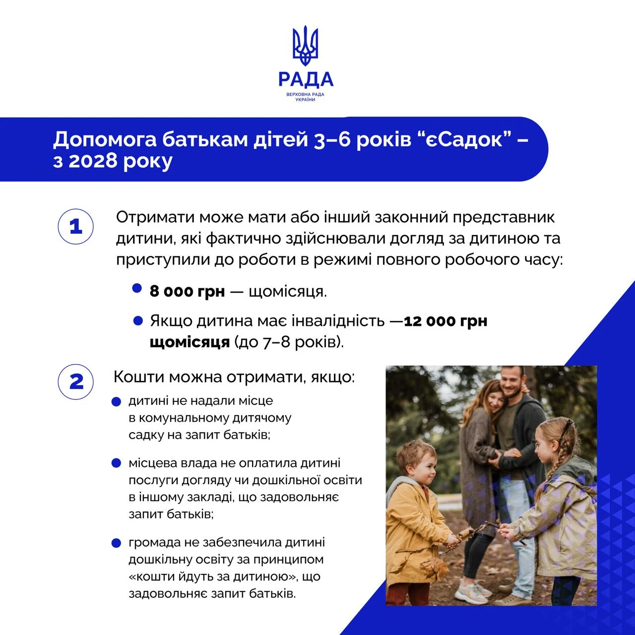 6. Щомісячна допомога батькам дітей віком від трьох до шести років «єСадок» (починаючи з 2028 року) – 8 000 грн. Якщо дитина має інвалідність — 12 000 грн щомісяця (до 7–8 років);