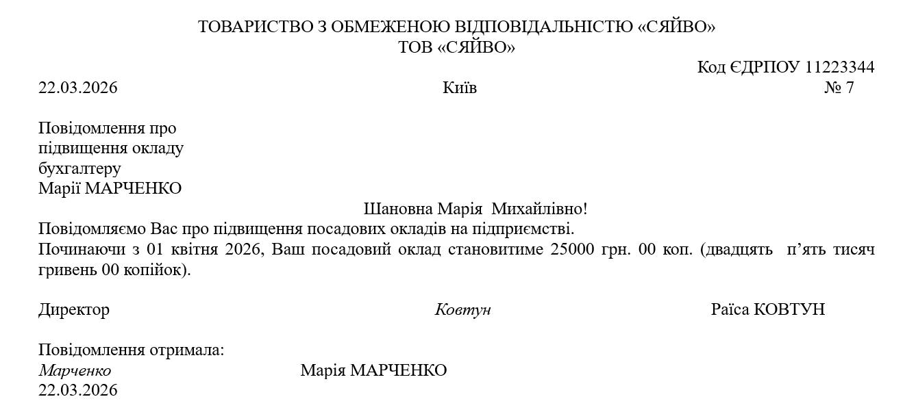 Трудове законодавство не регламентує в який спосіб оформлювати та здійснювати повідомлення про підвищення посадового окладу. Тому роботодавець визначає це самостійно. Це може бути повідомлення, як окремий документ або ознайомлення із наказом про підвищення посадового окладу. Якщо роботодавець приймає рішення запровадити окремий документ-повідомлення про зміну посадових окладів, він може виглядати так: