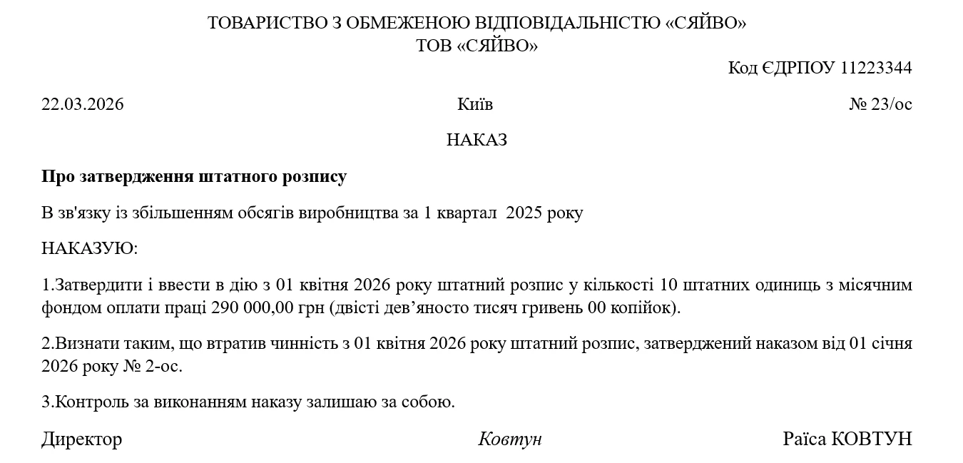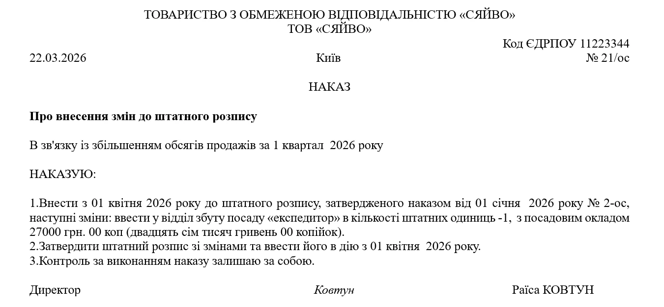 Зразок Наказу про внесення змін до штатного розпису у зв'язку зі збільшенням обсягів продажів