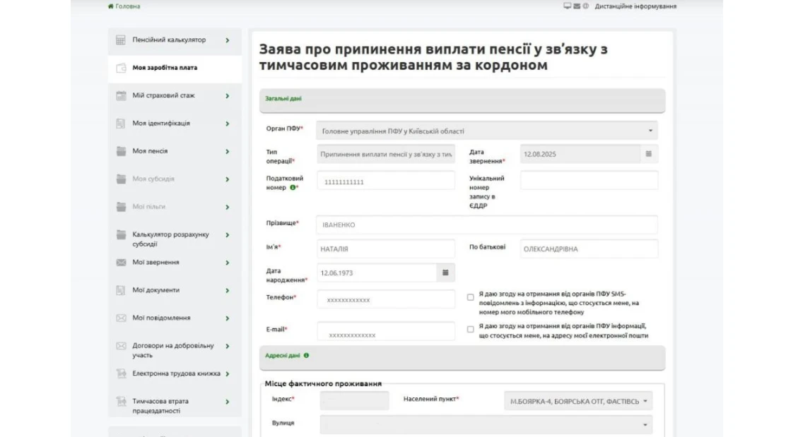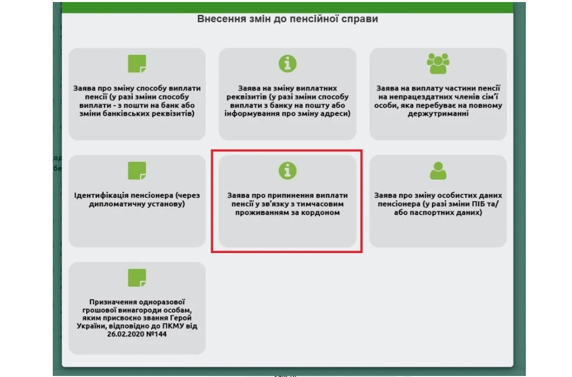 На вебпорталі електронних послуг Пенсійного фонду України реалізовано можливість подати в електронному вигляді заяву про припинення виплати пенсії у зв’язку з тимчасовим проживанням за кордоном.