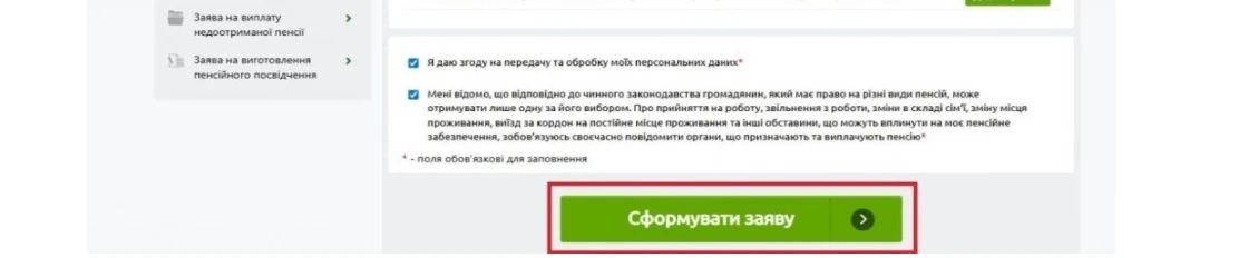 Крок 6. Надайте згоду на передачу та обробку персональних даних і підтвердьте, що ви ознайомлені з необхідністю повідомляти Пенсійний фонд України про зміни, що можуть впливати на пенсійне забезпечення. Сформуйте заяву.
