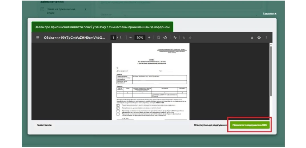Крок 7. Перевірте дані сформованої заяви та надішліть до Пенсійного фонду України, натиснувши кнопку «Підписати та відправити в ПФУ».