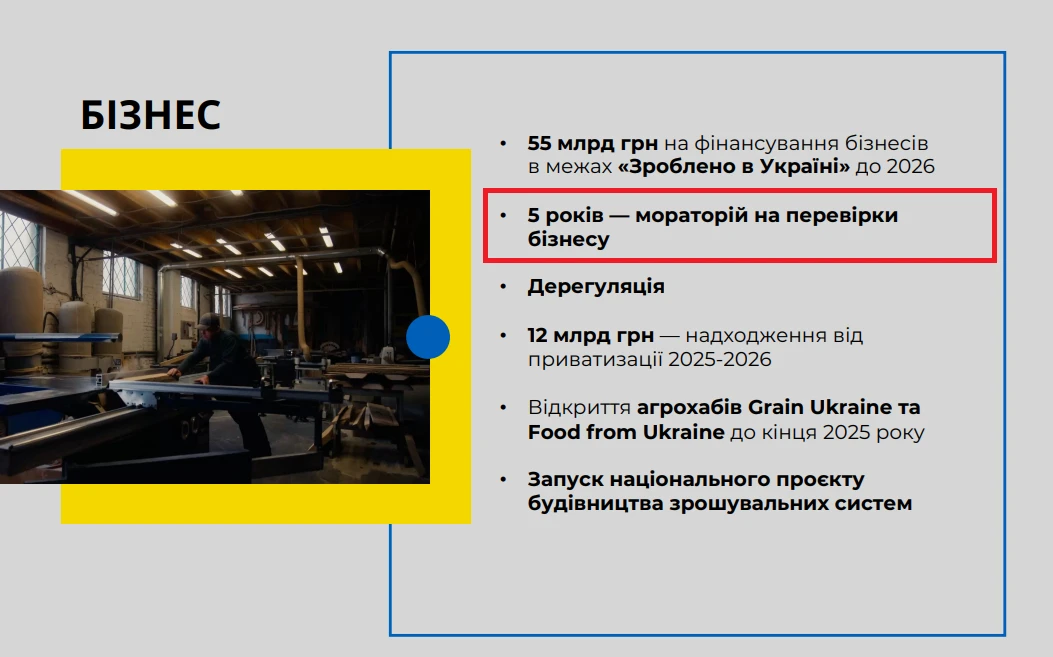 - запровадження п’ятирічного мораторію на перевірки бізнесу,