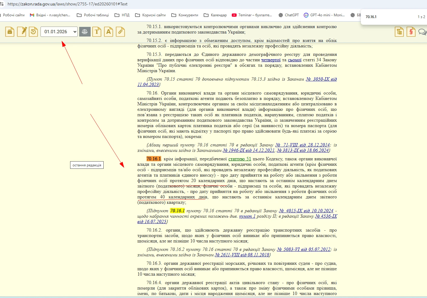 70.16.1. органи виконавчої влади та органи місцевого самоврядування, юридичні особи та фізичні особи - підприємці, податкові агенти – про дату прийняття на роботу або звільнення з роботи фізичних осіб протягом 20 календарних днів, що настають за останнім календарним днем звітного (податкового) місяця, а також інформацію, передбачену статтею 51 ПКУ;
