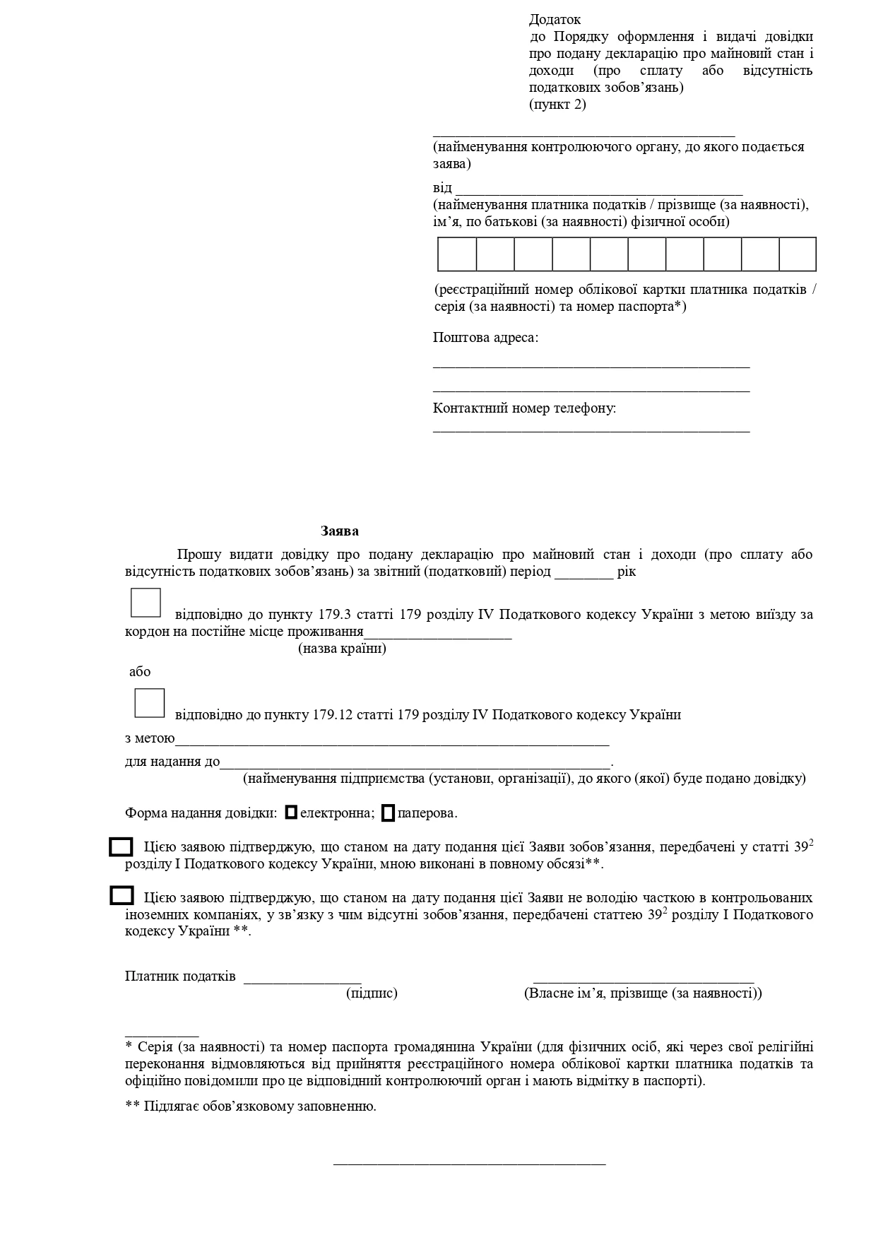 «* Для платників податку, визначених пунктом 179.3 статті 179 розділу IV Податкового кодексу України, ця довідка видається за відсутності заборгованості зі сплати податку на доходи фізичних осіб та військового збору, а також за умови відсутності невиконаних зобов’язань, визначених відповідно до статті 392 розділу І Податкового кодексу України.».