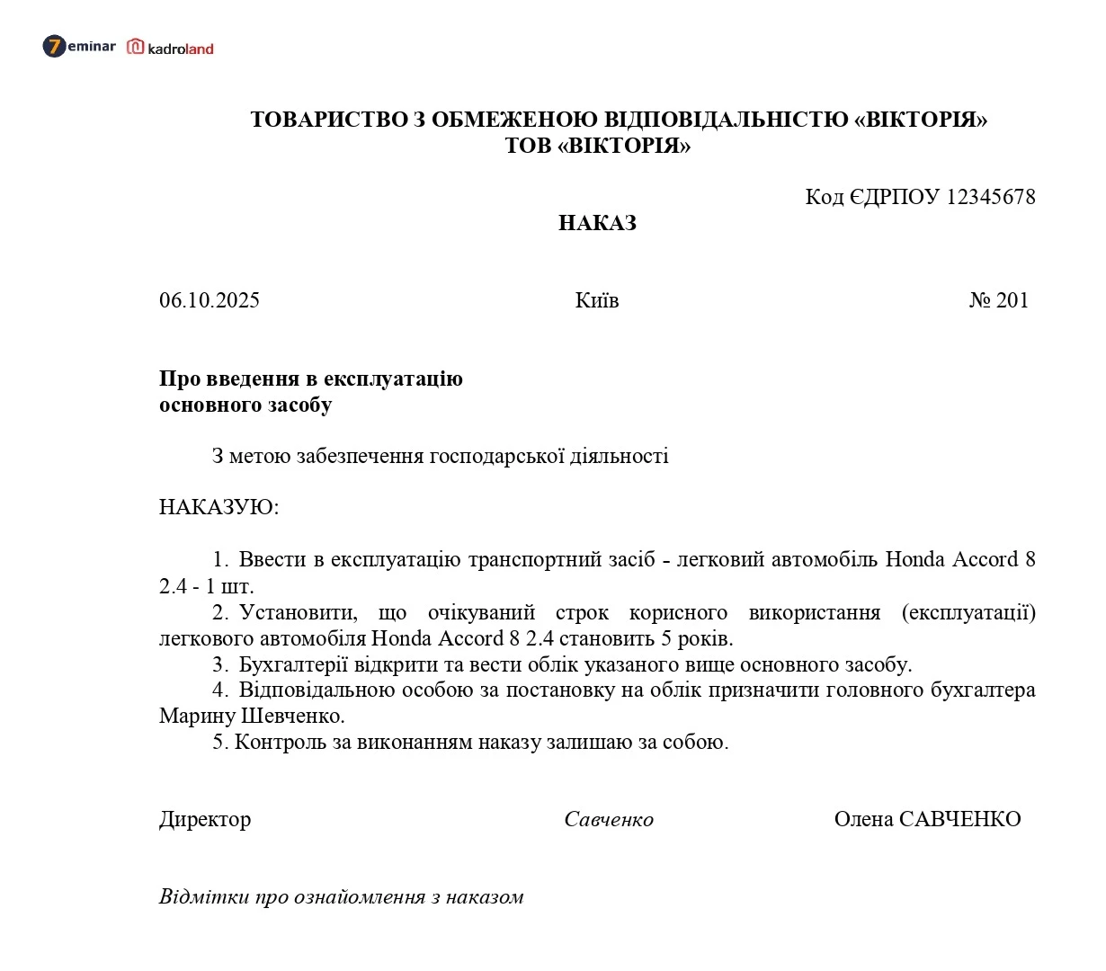 Наказ про введення в експлуатацію основного засобу (автомобіля)