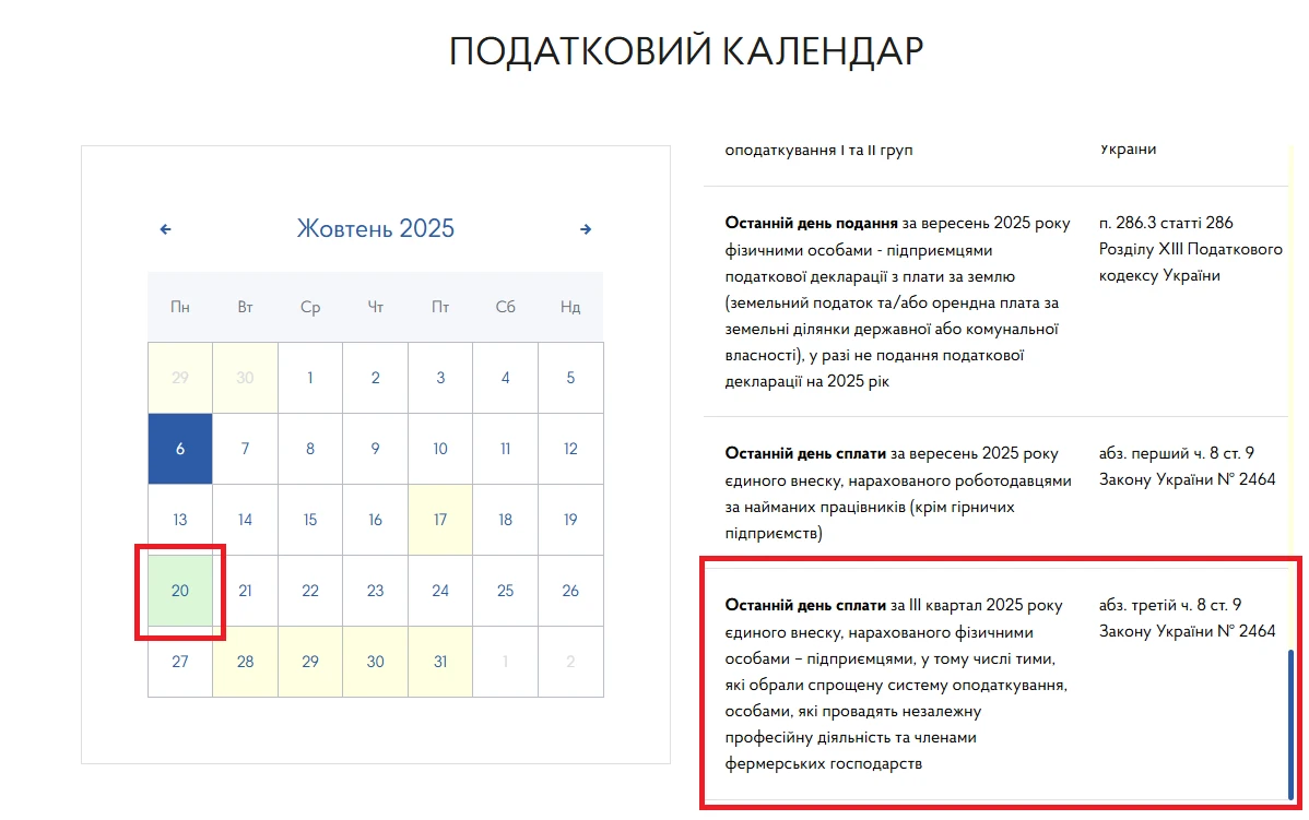 Наш календар повністю відповідає календарю ДПС і згідно з ним, останнім днем сплати ЄСВ ФОПами за ІІІ квартал 2025 року є 20 жовтня 2025 року.