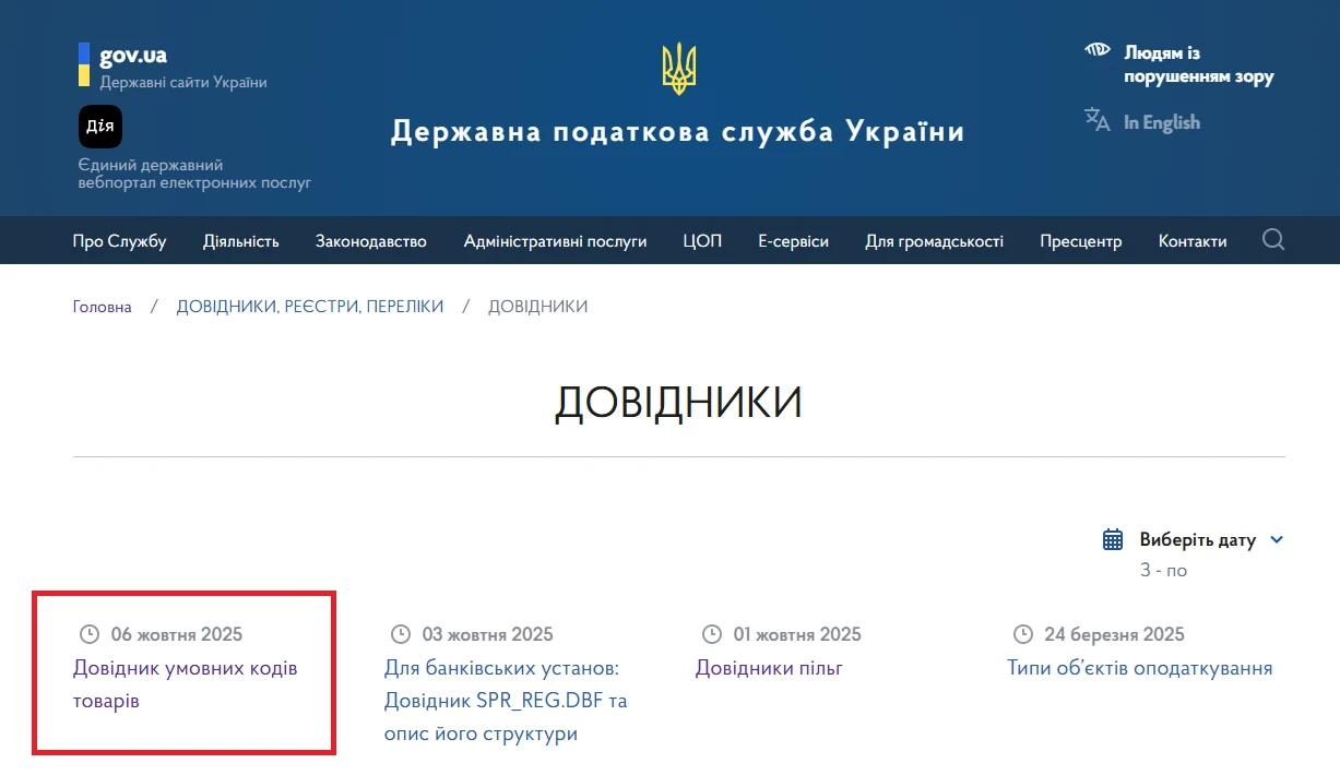 Довідник умовних кодів товарів розміщено на головній сторінці офіційного вебпорталу Державної податкової служби України в рубриці Головна/Довідники, Реєстри, Переліки/Довідники/Довідник умовних кодів товарів