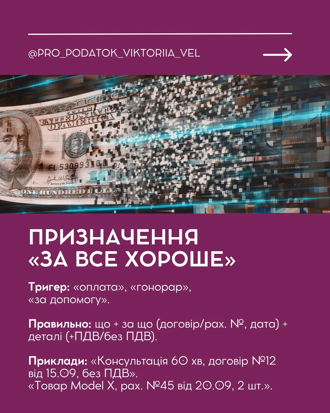 - Пишіть призначення платежу зрозуміло: вказуйте, що саме оплачується, за що і на підставі якого документа. Наприклад: «Послуги консультації, договір №12 від 15.09, без ПДВ».