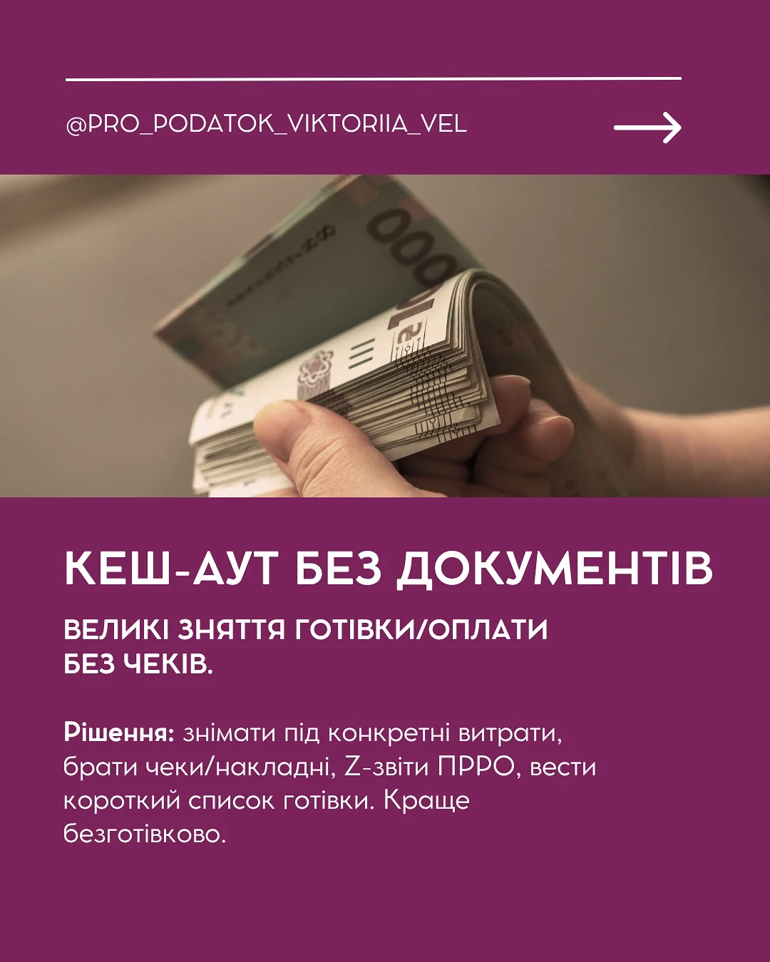 - Знімайте готівку тільки під конкретні витрати і обов'язково зберігайте документи: чеки, Z-звіти, накладні.