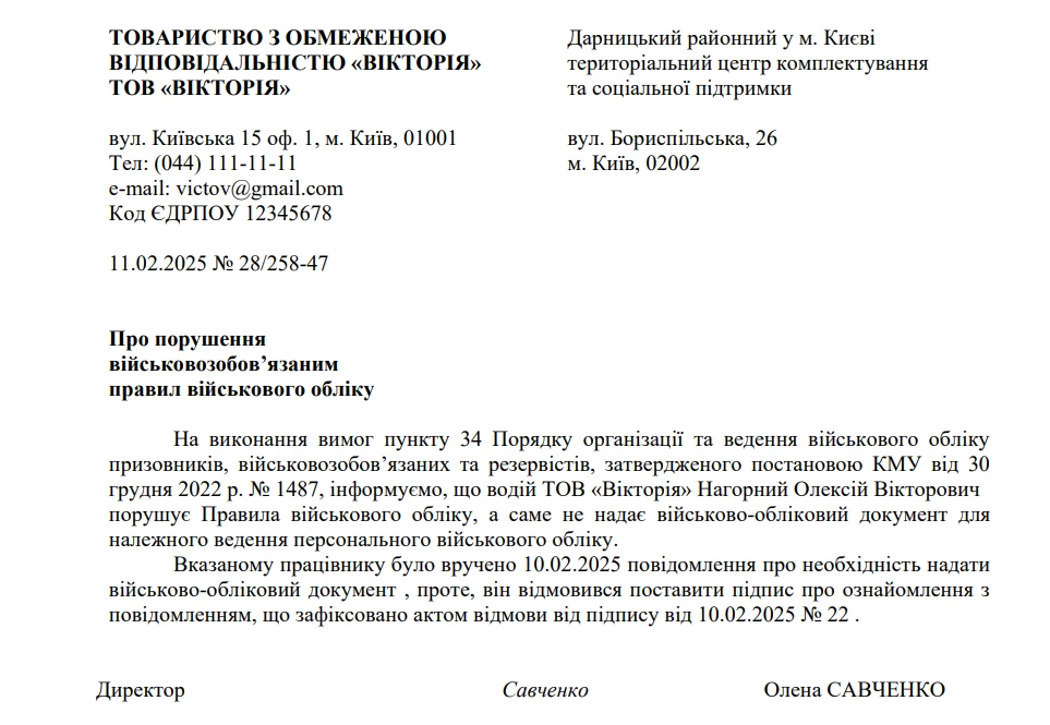 Завантажуйте шаблон та зразок: Лист до ТЦК про порушення військовозобов’язаним правил військового обліку (ненадання ВОД)