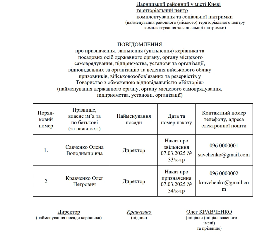 Незважаючи на те, що Списки персонального військового обліку не ведуться, підприємство зобов’язане повідомити ТЦК про призначення керівника у 7-денний строк з моменту видання наказу.