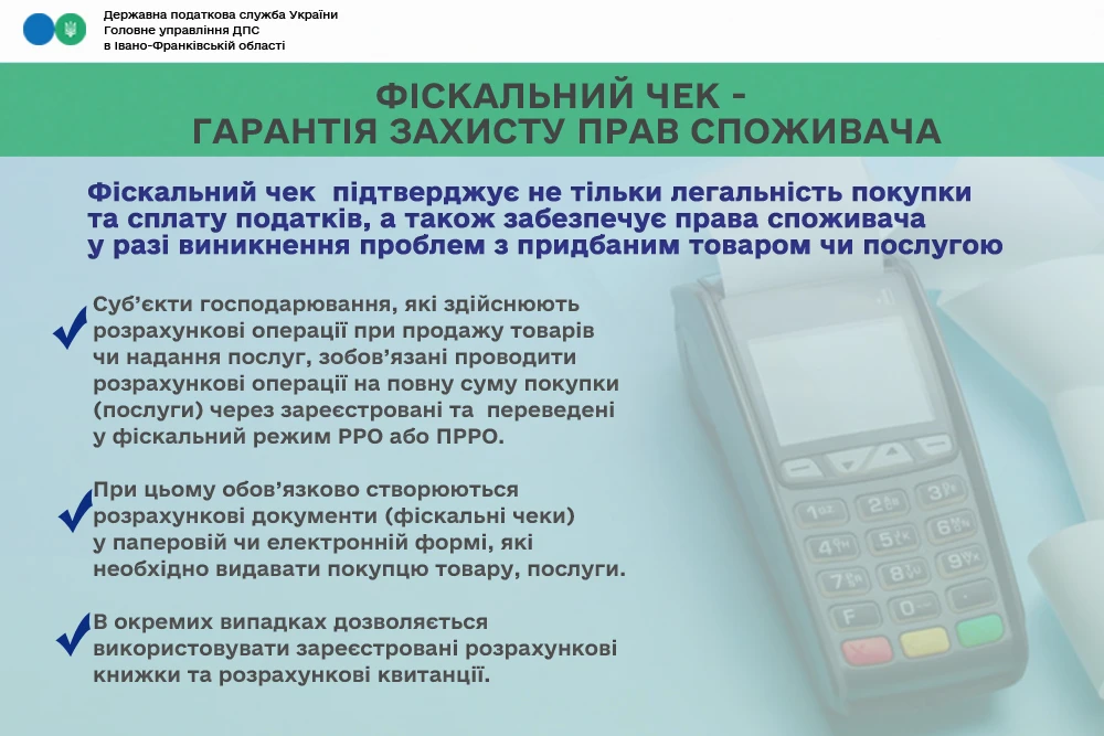 В ГУ ДПС в Івано-Франківській області розробили листівку, яка пояснює, яким чином фіскальний чек не лише підтверджує дотримання податкового законодавства продавцем, але й охороняє права споживача, у випадку виникнення проблем з придбаним товаром.