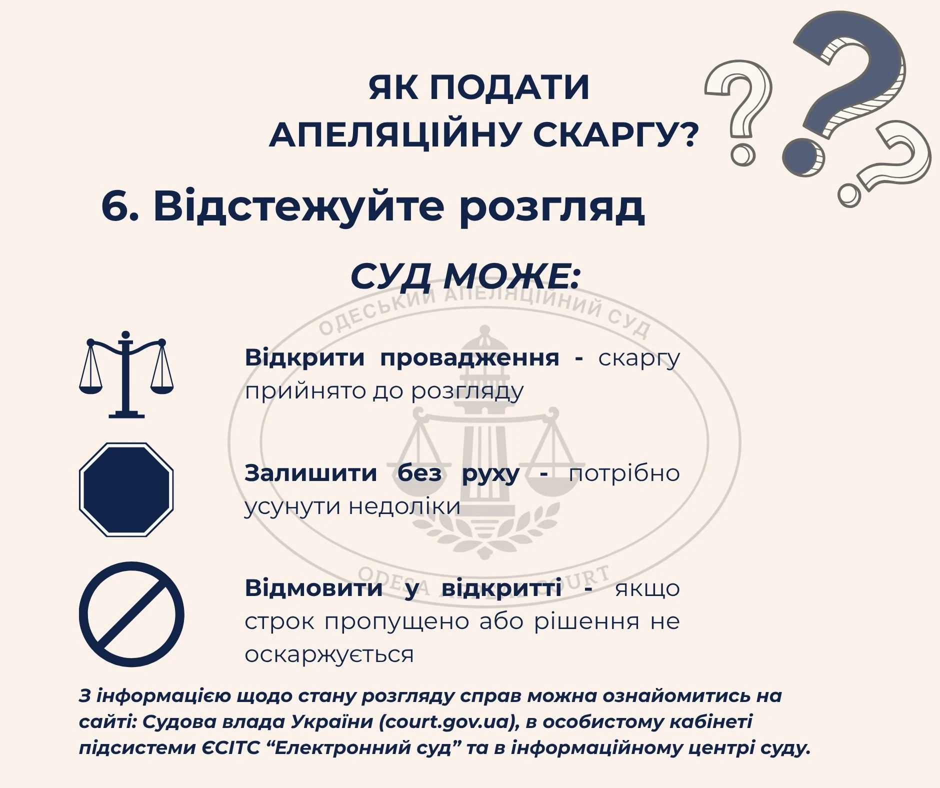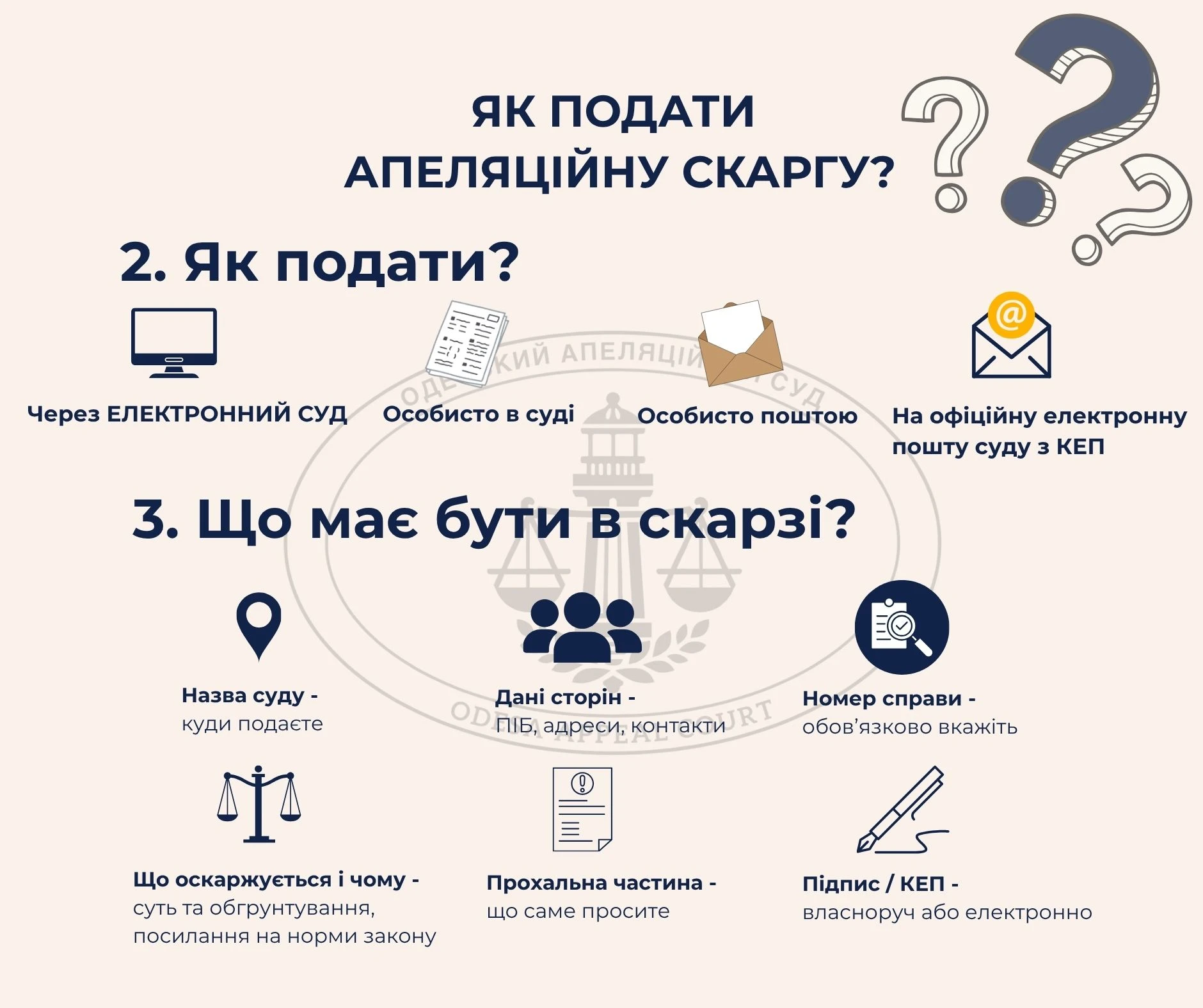 З метою просвітницької діяльності, Одеський апеляційний суд підготував інфографіку, яка допоможе громадянам краще зрозуміти порядок подання апеляційної скарги.