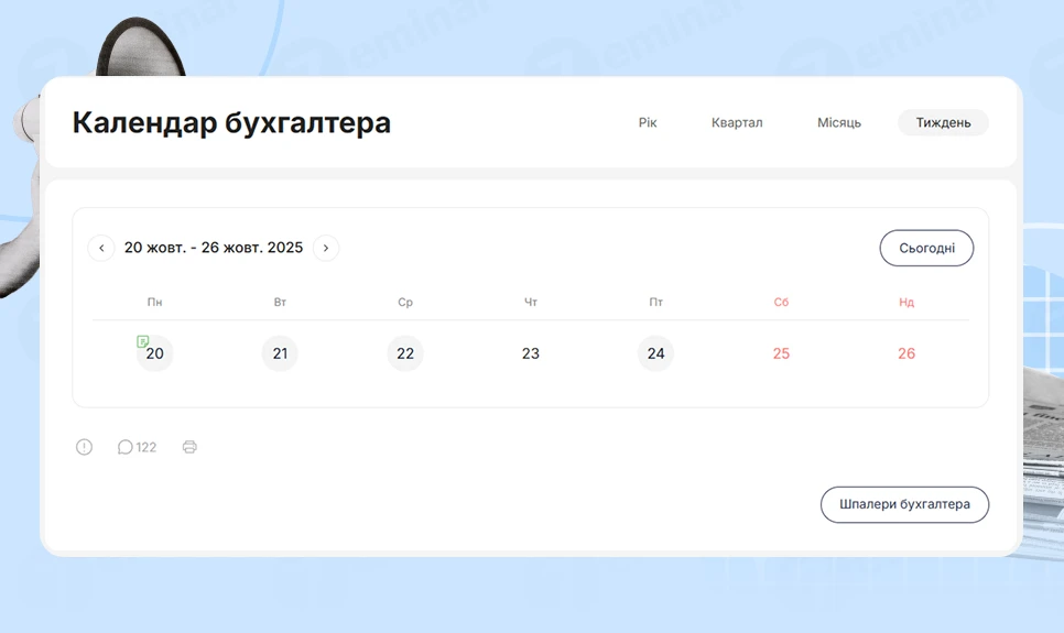 Скористайтеся новим сервісом «Календар бухгалтера» – це сучасно, зручно і надзвичайно ефективно! Уся звітність в одному місці: на тиждень, місяць і навіть рік! А тепер, в календарі закріплені Шпалери бухгалтера, які будуть оновлюватися щомісяця! Все найважливіше завжди перед очима! Спробуйте та пишіть свої враження!