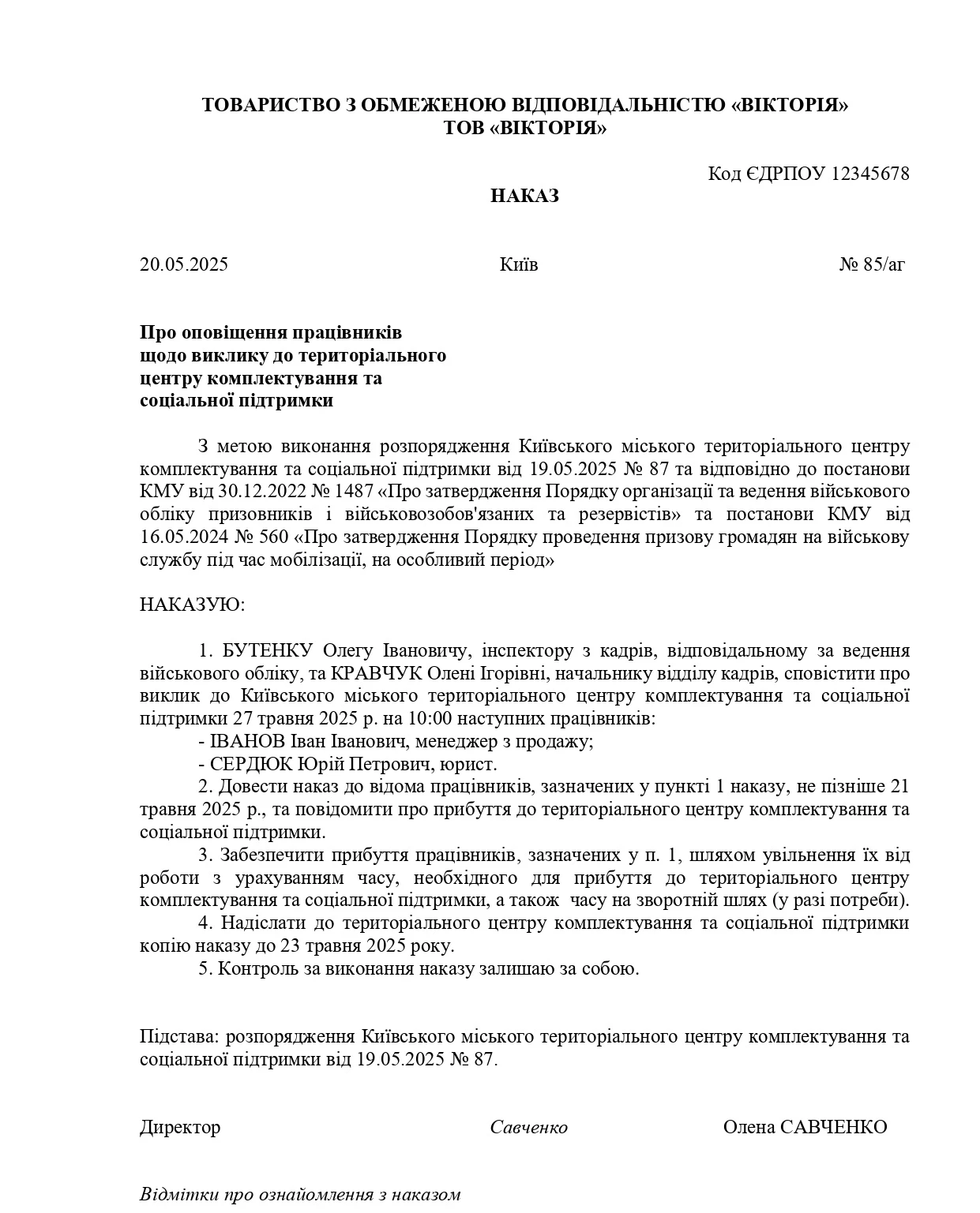 - Наказ про оповіщення працівників щодо виклику до ТЦК та СП
