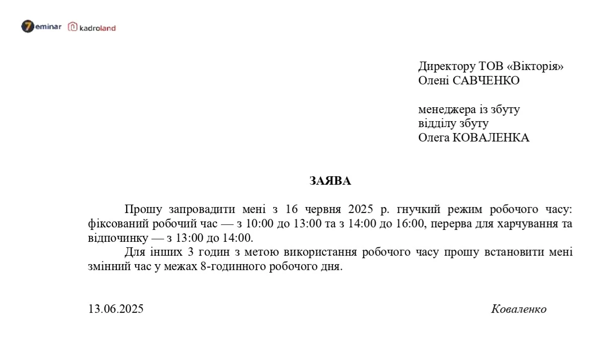 Зразок Заяви про встановлення гнучкого режиму робочого часу
