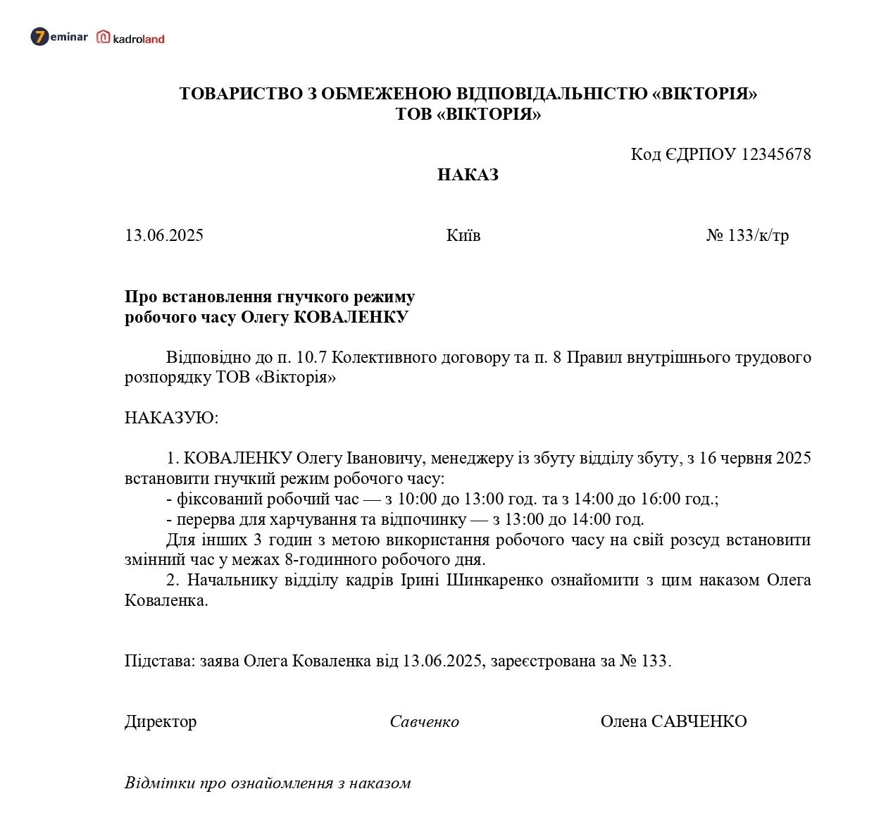 Наказ про встановлення гнучкого режиму робочого часу за заявою працівника
