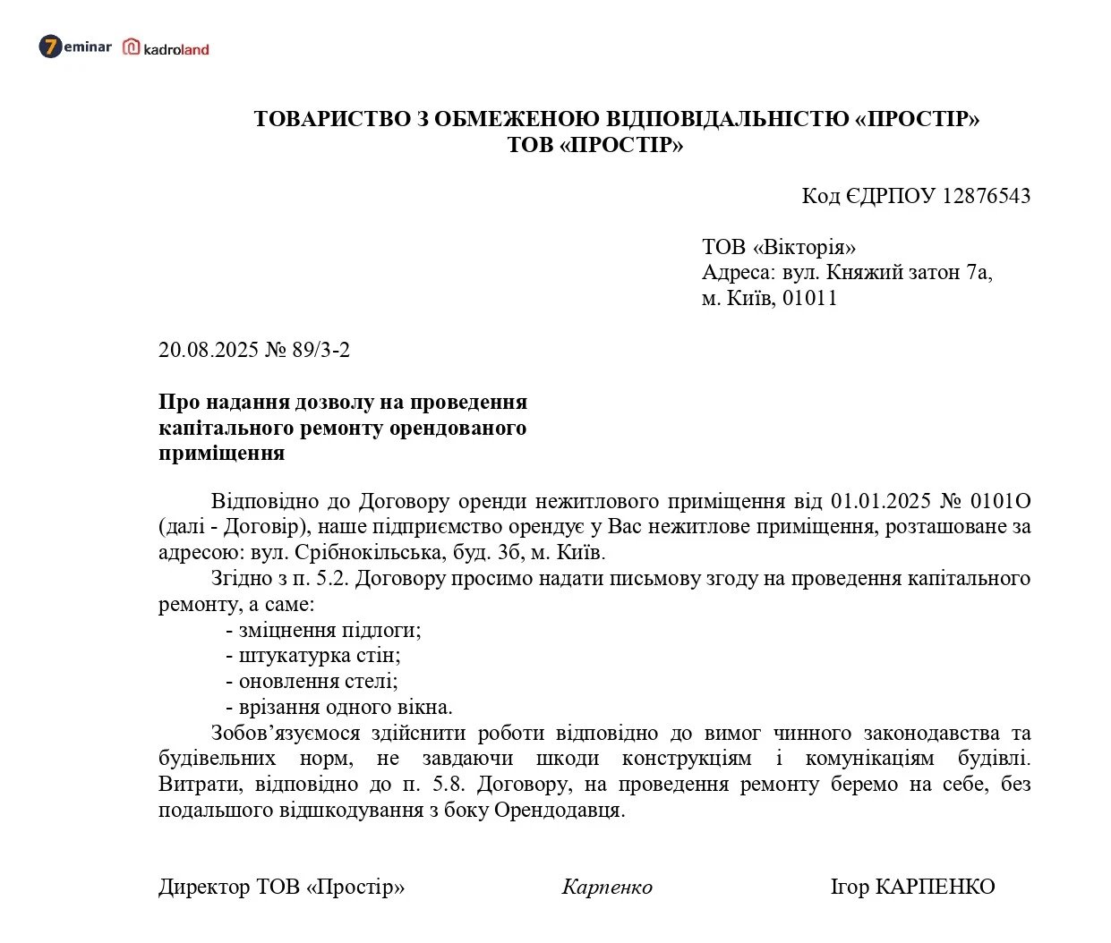 Лист-запит про отримання дозволу орендодавця на проведення капітального ремонту приміщення