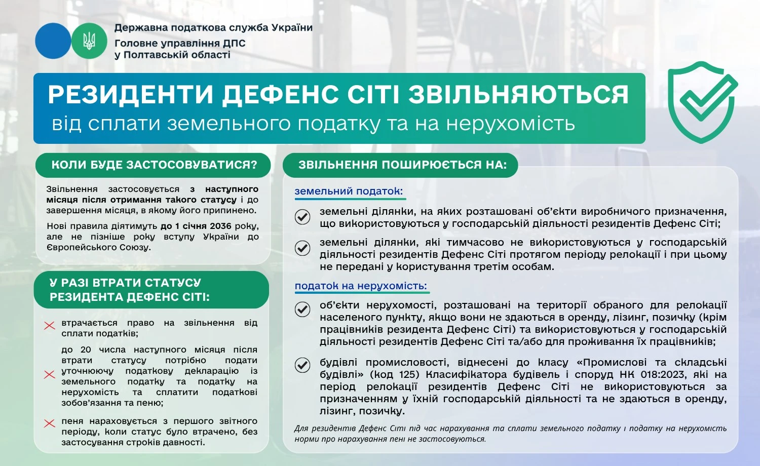 Для резидентів Дефенс Сіті під час нарахування та сплати земельного податку і податку на нерухомість норми про нарахування пені не застосовуються.