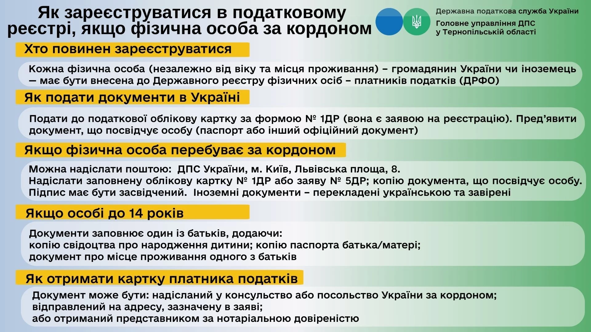 Відповідно до пункту 70.5 Податкового кодексу України та пункту 1 розділу VII Положення про реєстрацію фізичних осіб у Державному реєстрі фізичних осіб – платників податків, затвердженого наказом Мінфіну від 29.09.2017 №822 (далі – Положення №822), кожна фізична особа – незалежно від віку, громадянства або місця проживання – зобов’язана бути зареєстрованою у Державному реєстрі фізичних осіб – платників податків (далі – ДРФО).