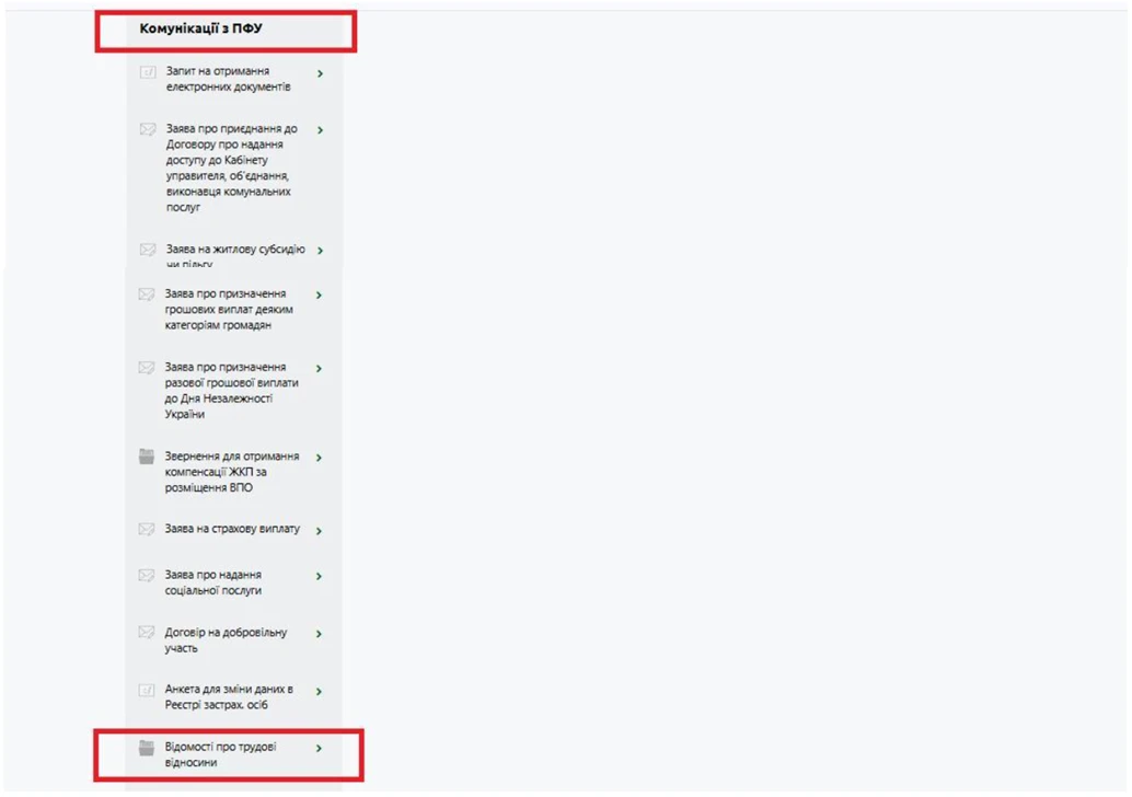 Крок 2. У розділі «Комунікації з ПФУ» оберіть вкладку «Відомості про трудові відносини».