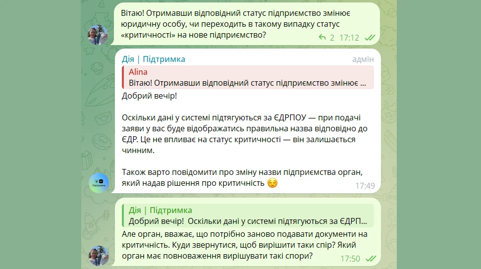 Оскільки дані у системі підтягуються за ЄДРПОУ – при подачі заяви у вас буде відображатись правильна назва відповідно до ЄДР. Це не впливає на статус критичності – він залишається чинним. Також варто повідомити про зміну назви підприємства орган, який надав рішення про критичність.
