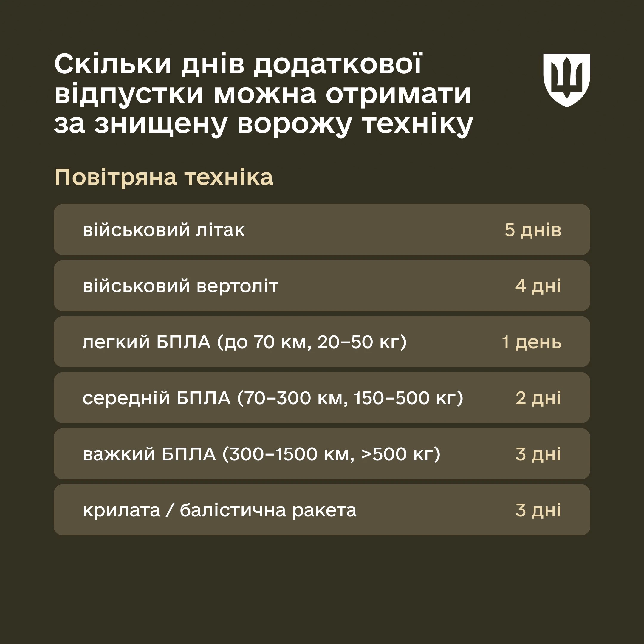 Військовослужбовцям надається додаткова відпустка за знищену ворожу техніку. Її загальна тривалість не повинна перевищувати 15 календарних днів на рік і залежить від виду знищеної техніки.