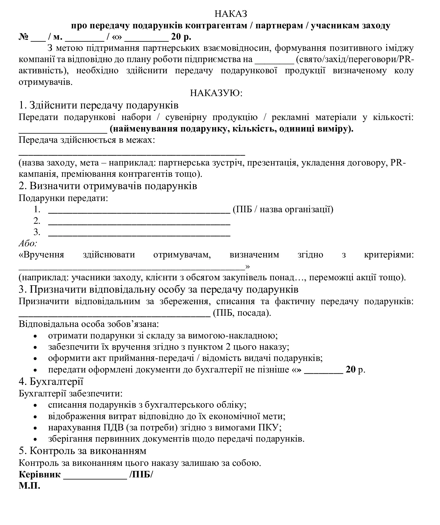 Примірний шаблон наказу про вручення подарунків контрагентам