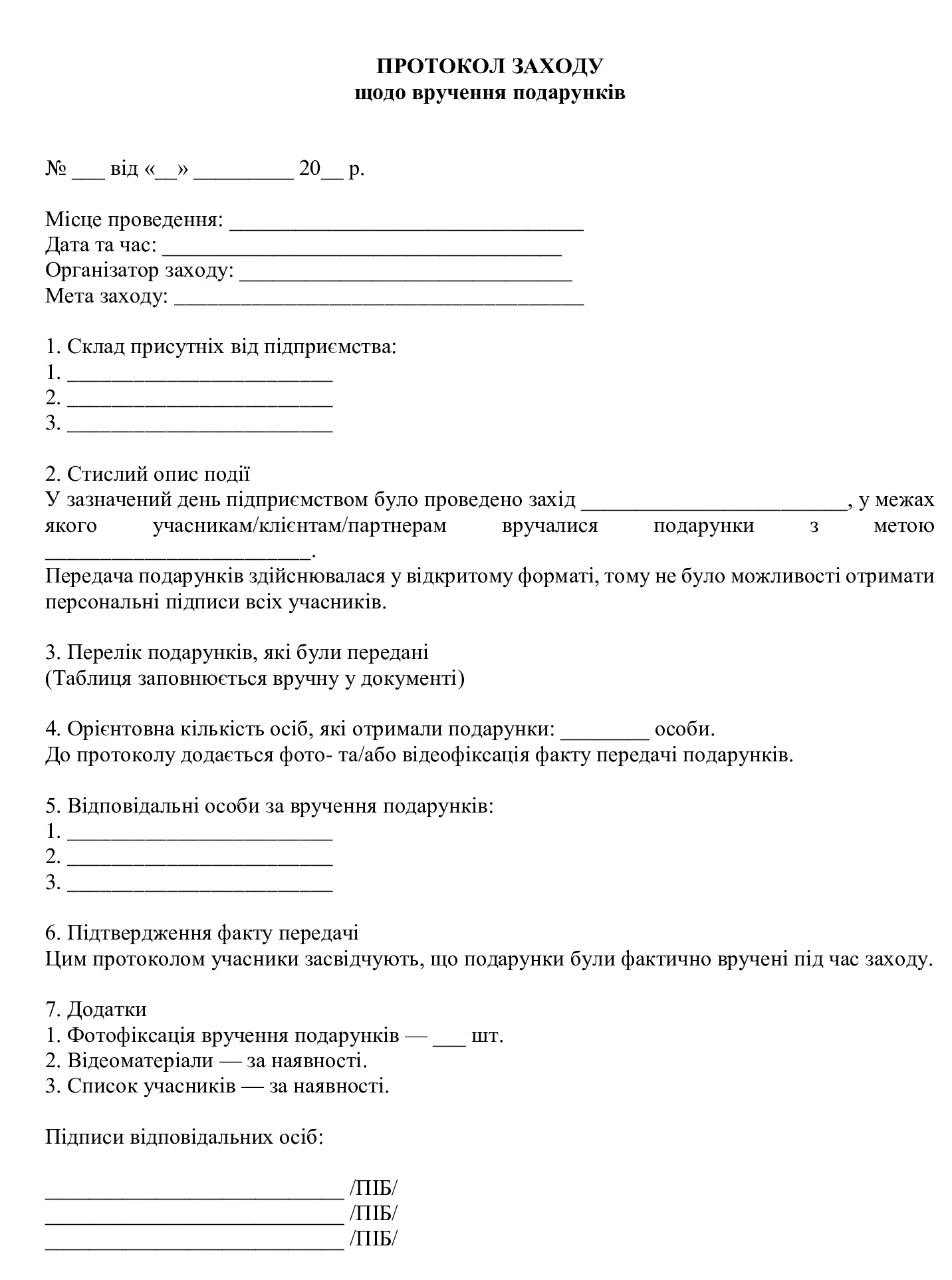 Примірний шаблон протоколу заходу щодо вручення подарунків