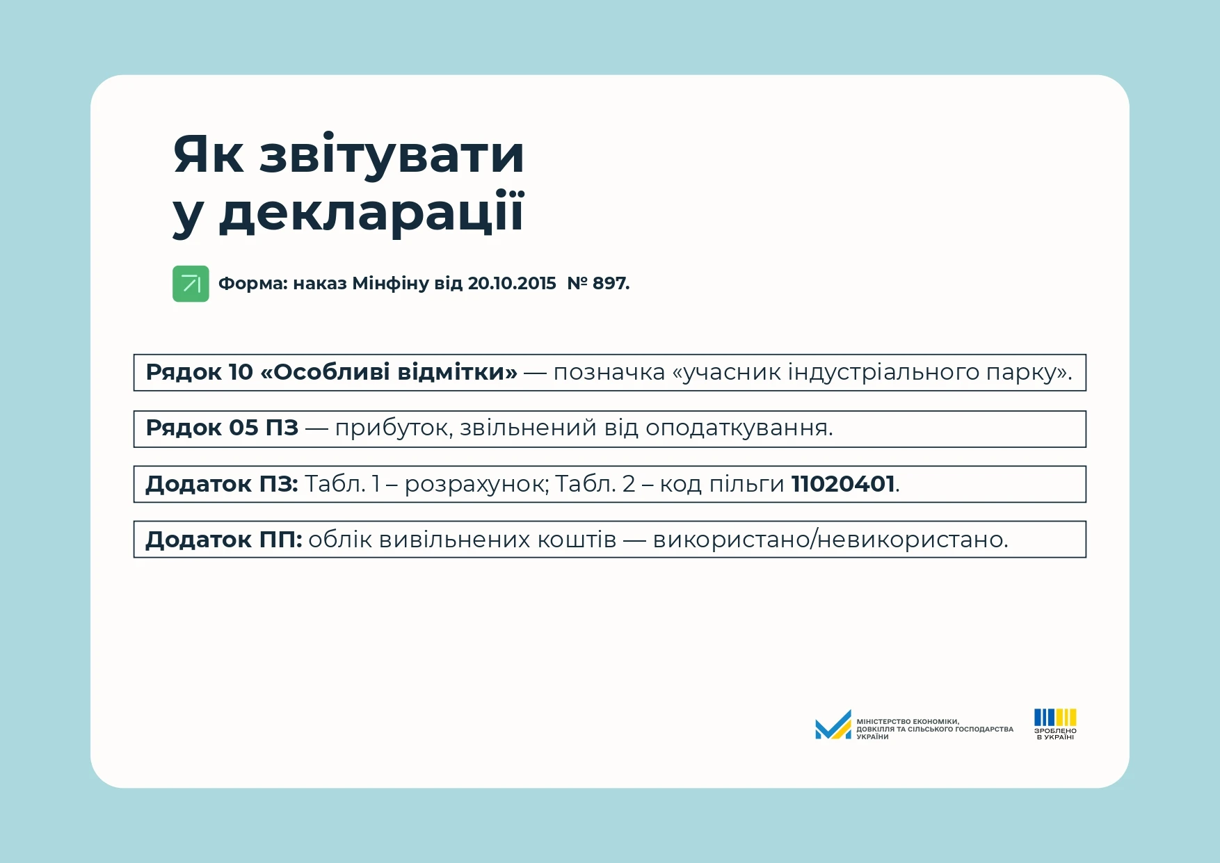 Міністерство економіки, довкілля та сільського господарства України підготувало детальний гайд щодо застосування податкових стимулів для учасників індустріальних парків (далі – ІП). Документ підготовлено як практичний довідник для виробників, які вже працюють або планують розпочати діяльність на території індустріального парку. У гайді зібрано чинні роз’яснення та інструкції Державної податкової служби України.