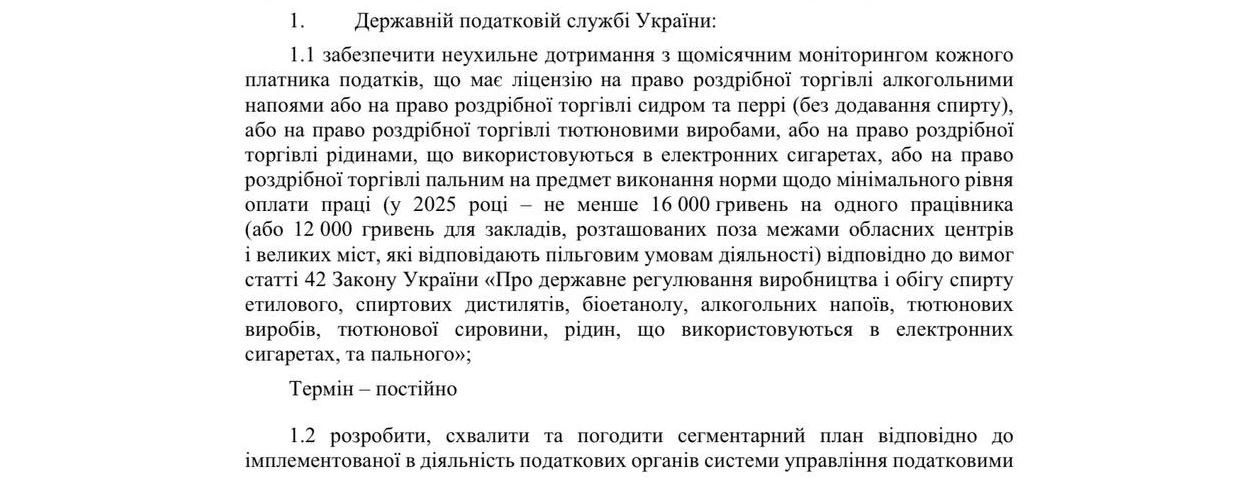 - Постійно перевіряти підприємців із ліцензією на торгівлю алкоголем чи тютюном щодо виплати середньої зарплати мінімум на рівні двох мінімальних заробітних плат.
