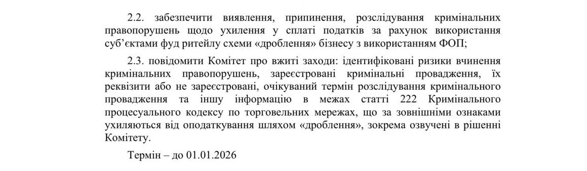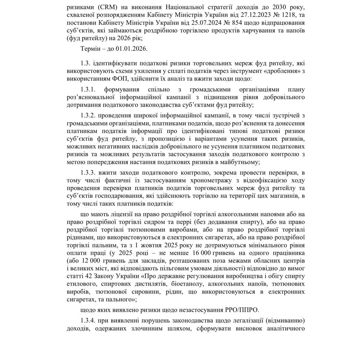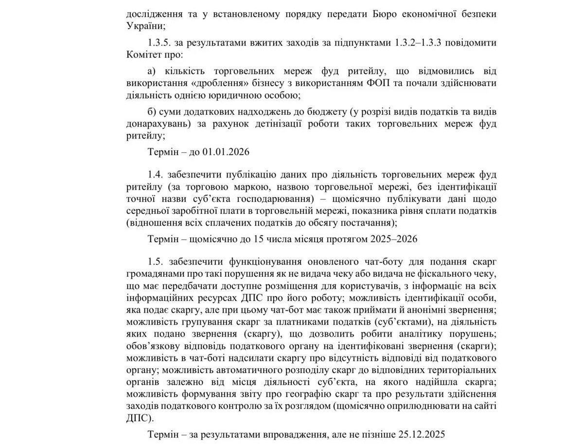 - До 1 січня 2026 року розробити автоматичну CRM-систему для автоматичного контролю аномальних показників у діяльності підприємців роздрібної торгівлі.