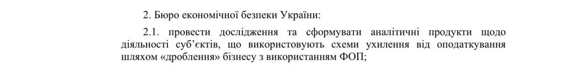 - Забезпечити виявлення, припинення та розслідування справ щодо ділення бізнесу на ФОП.
