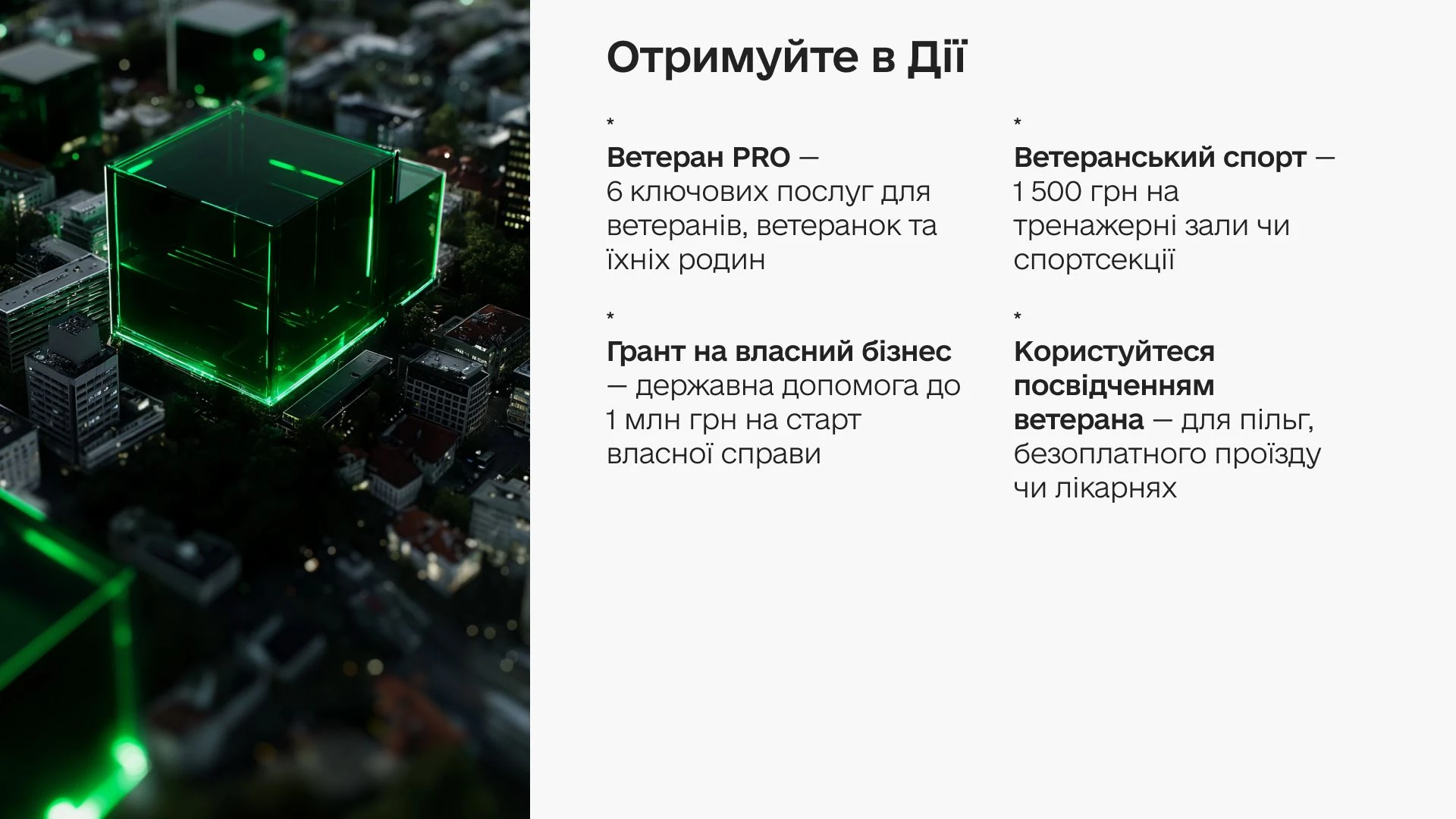 - Ветеран PRO – цифровий простір у Дії для ветеранів, ветеранок і їхніх родин. Тут зібрані головні послуги – від програми єОселя до допомоги на спорт і пошуку фахівця супроводу.