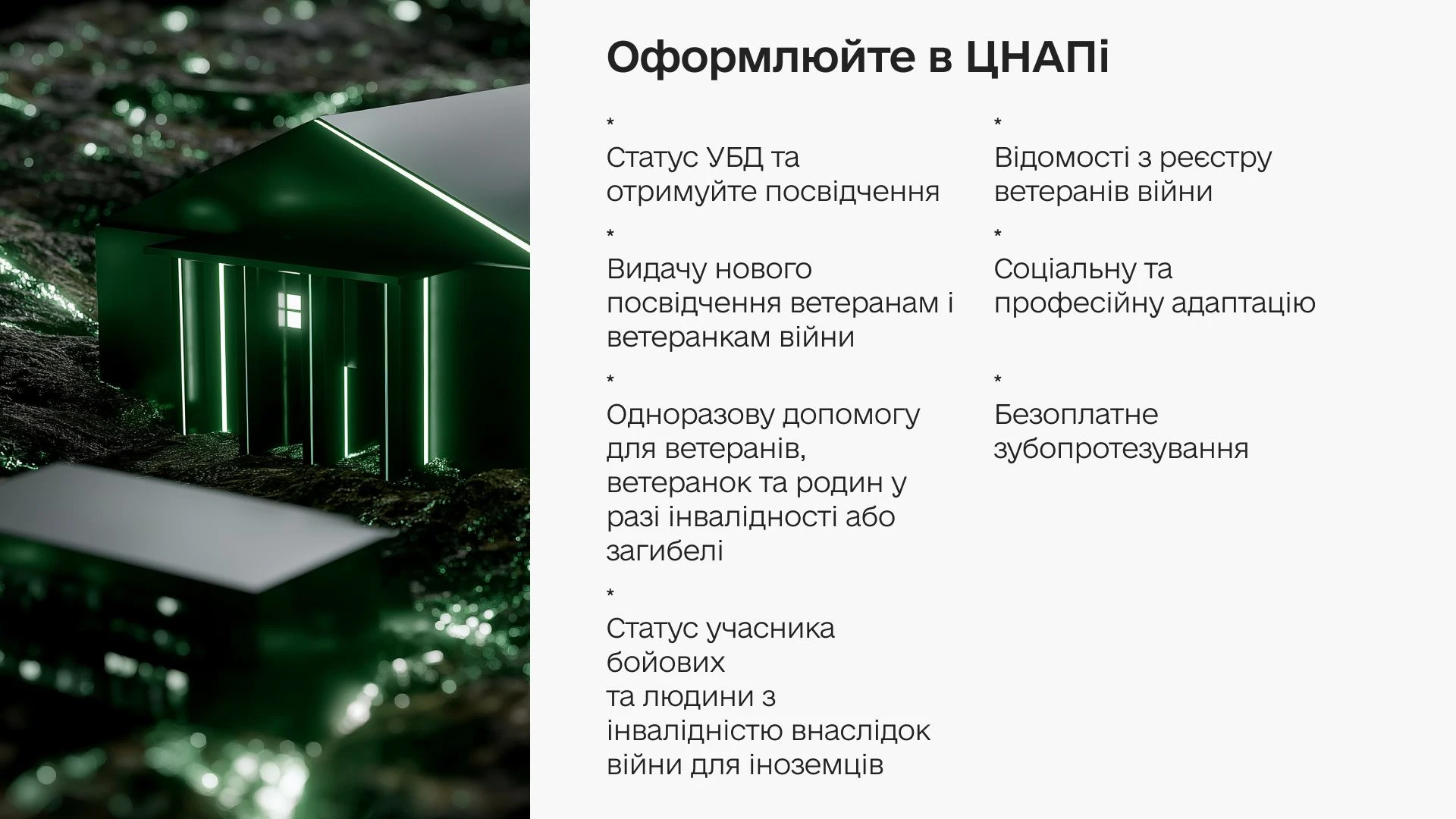 - «Єдине вікно» для ветеранів – це зручні місця обслуговування ветеранів і ветеранoк у ЦНАПах. У 1856 ЦНАПах створюють такі зони, де послуги надають швидше, без черг і з урахуванням потреб ветеранської спільноти.