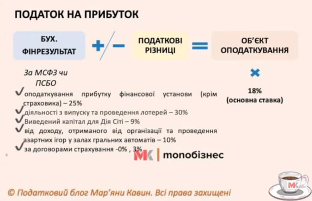 Юридична особа на загальній системі сплачує податок на прибуток за ставкою 18% від бухгалтерського фінансового результату: доходи мінус витрати. Для фінансових установ, страховиків, організаторів лотерей і азартних ігор ставки інші (див. Інфографіку 1), але у більшості випадків це базові 18%.