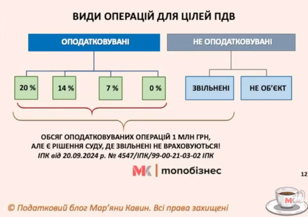 Стандартна ставка ПДВ для юридичних осіб на загальній системі – 20%, але можливі 7%, 14% або 0% для експорту товарів й міжнародних перевезень. А можуть операції бути звільнені або необ’єктні. Тобто тут як пощастить (див. Інфографіку 2).