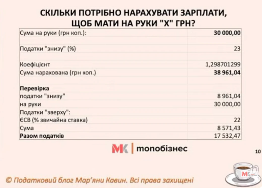 Отриманий коефіцієнт ми просто множимо на 30 000 грн – виходить 38 961,04 грн. Утримані із цієї суми податки (податки «знизу») становлять 8961,04 грн. Податок «зверху» (нарахування): ЄСВ – 22% від нарахованої зарплати = 8571,43 грн. Разом усі податки (знизу + зверху): 17 532,47 грн.