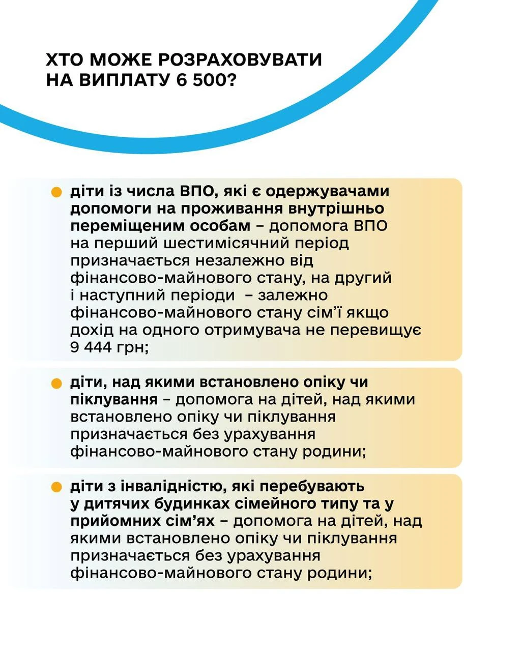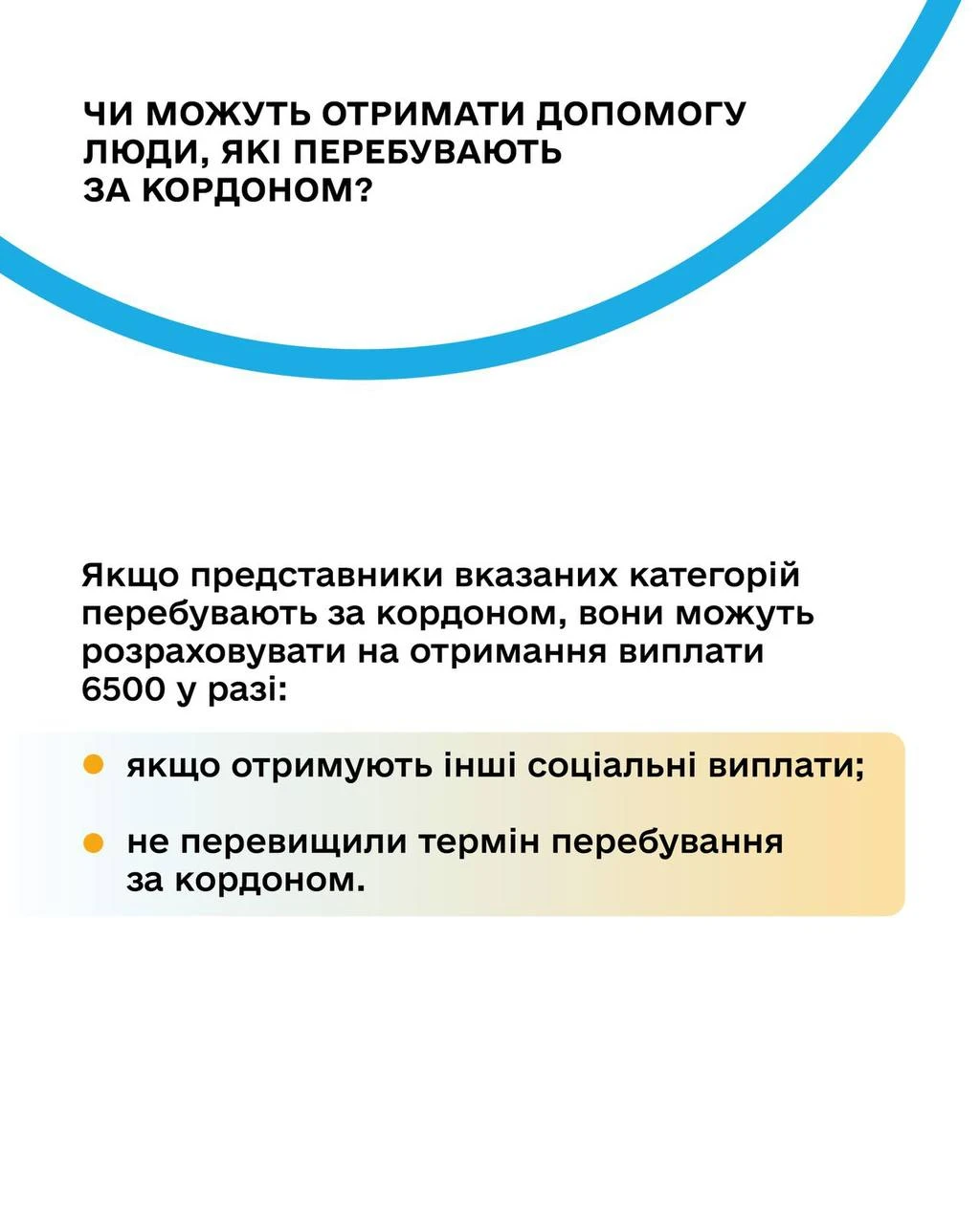 Якщо представники вказаних категорій перебувають за кордоном, вони можуть розраховувати на отримання виплати 6500 у разі: