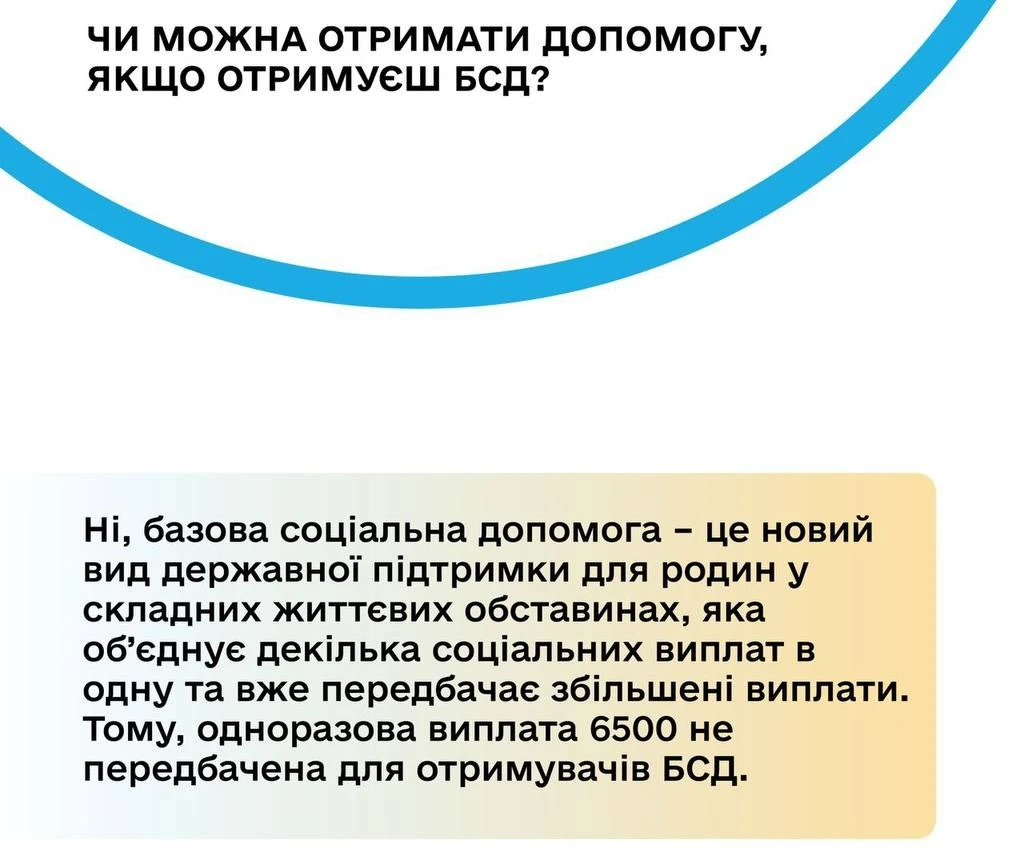 Ні, базова соціальна допомога – це новий вид державної підтримки для родин у складних життєвих обставинах, яка об'єднує декілька соціальних виплат в одну та вже передбачає збільшенні виплати. Тому одноразова виплата 6500 не передбачена для отримувачів БСД.