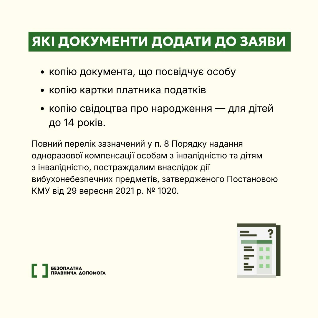 Якщо інвалідність виникла через ушкодження від вибухонебезпечних предметів, держава передбачає одноразову компенсацію.