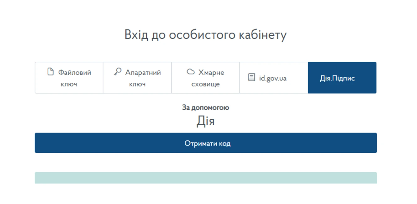 Для входу до особистого кабінету за допомогою мобільного застосунку Дія потрібно обрати спосіб входу «Дія. Підпис» та натиснути на кнопку «Отримати код»: