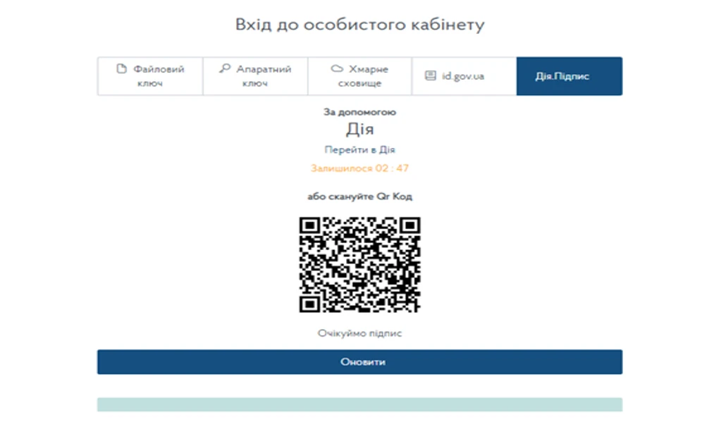 Далі відсканувати QR-код та здійснити підтвердження особи через мобільний додаток ДІЯ: