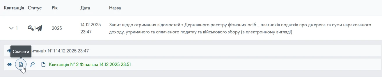 Відомості з Державного реєстру фізичних осіб-платників податків про суми виплачених доходів та утриманих податків можна переглянути без збереження або завантажити у форматі PDF – інформаційна довідка, або завантажити відповідь, засвідчену кваліфікованою електронною печаткою ДПС.