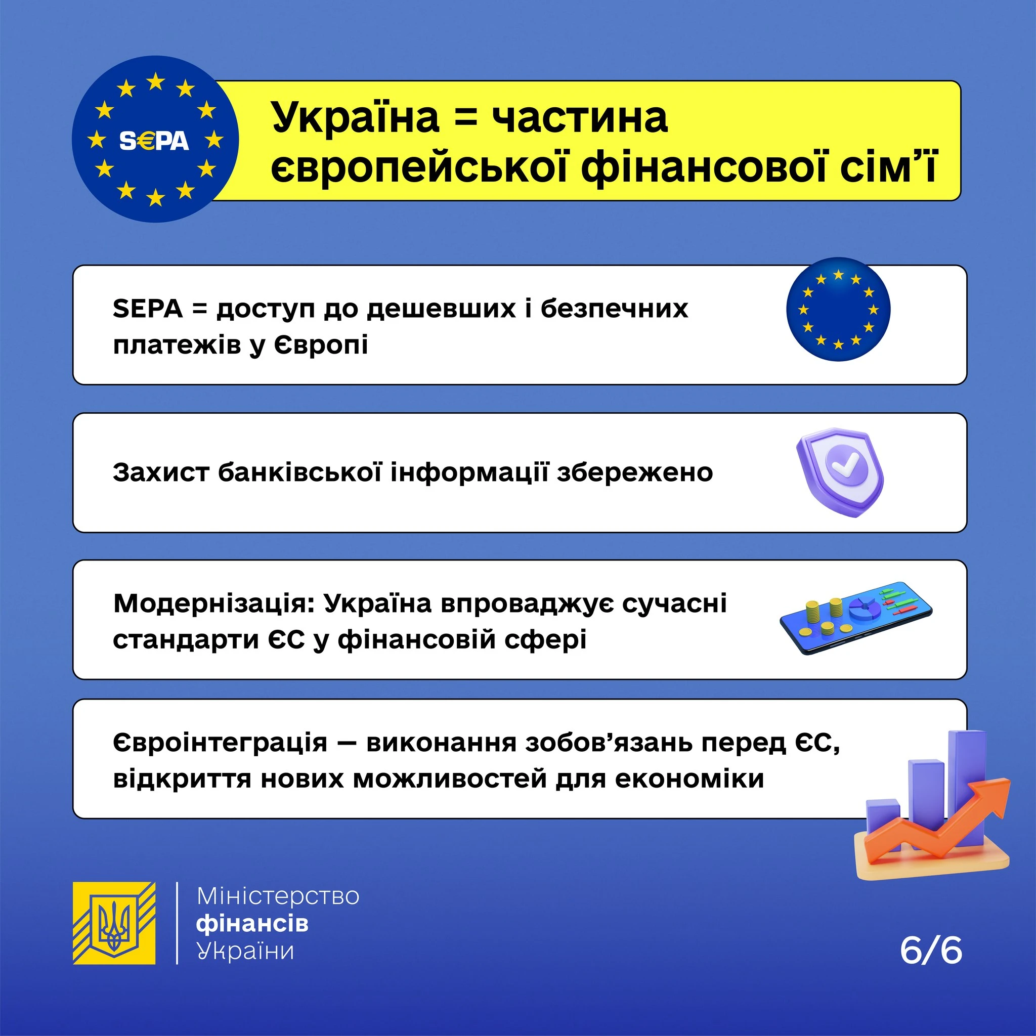 17.12.2025 Мінфін повідомив, що Уряд схвалив законопроєкт №14327, необхідні для приєднання до Єдиної зони платежів у євро (SEPA). Це означає, що Україна стане ближчою до європейського фінансового простору, де вже понад 500 мільйонів людей, а також компанії, користуються простими і зрозумілими правилами переказу коштів.