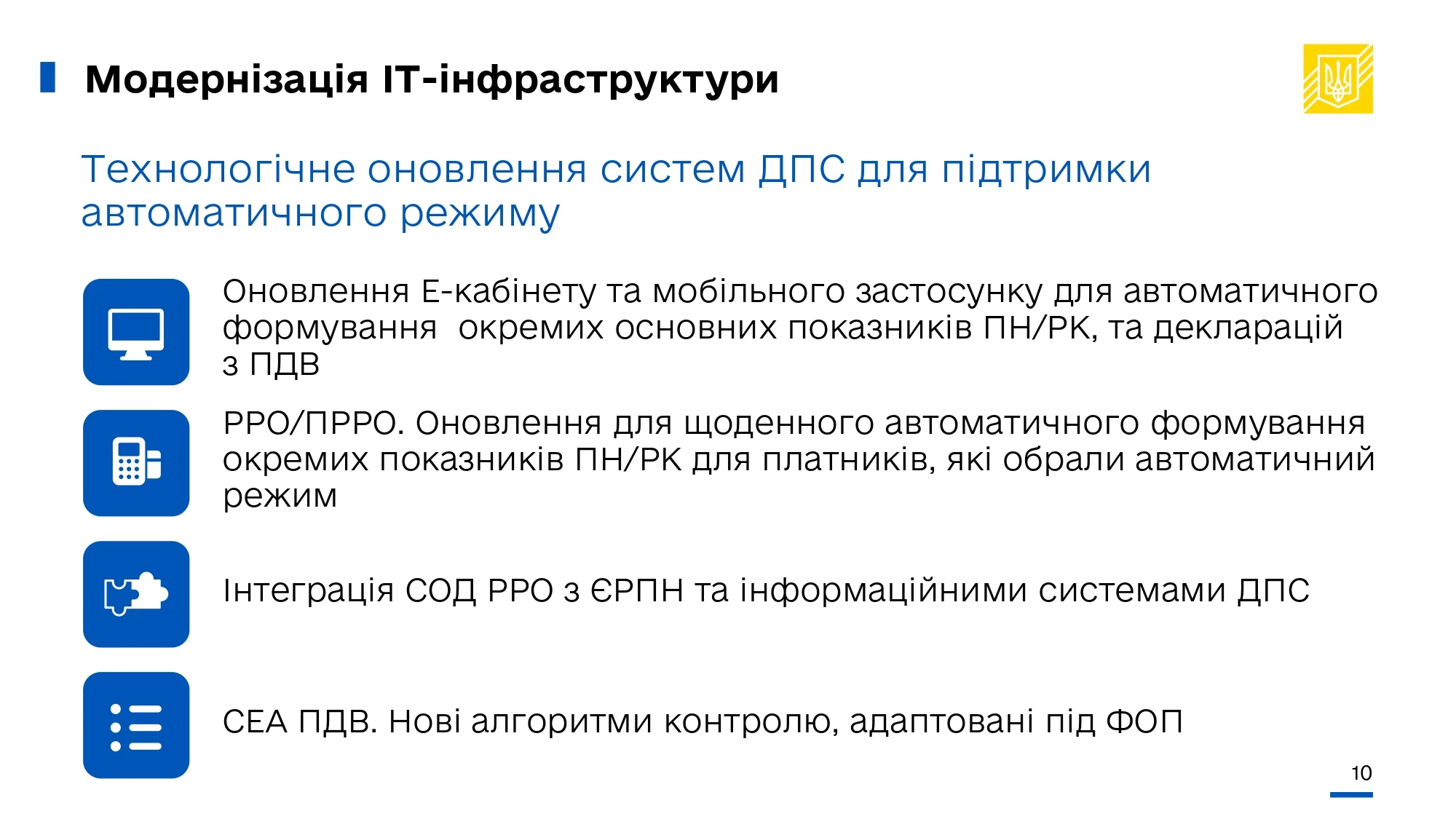 В рамках сервісної моделі держава бере на себе частину адміністративної процедури. Наше завдання – зробити так, щоб ведення ПДВ для ФОП мінімально вплинуло на умови бізнесу. Для цього ми розширимо перелік автоматичних процедур адміністрування ПДВ.